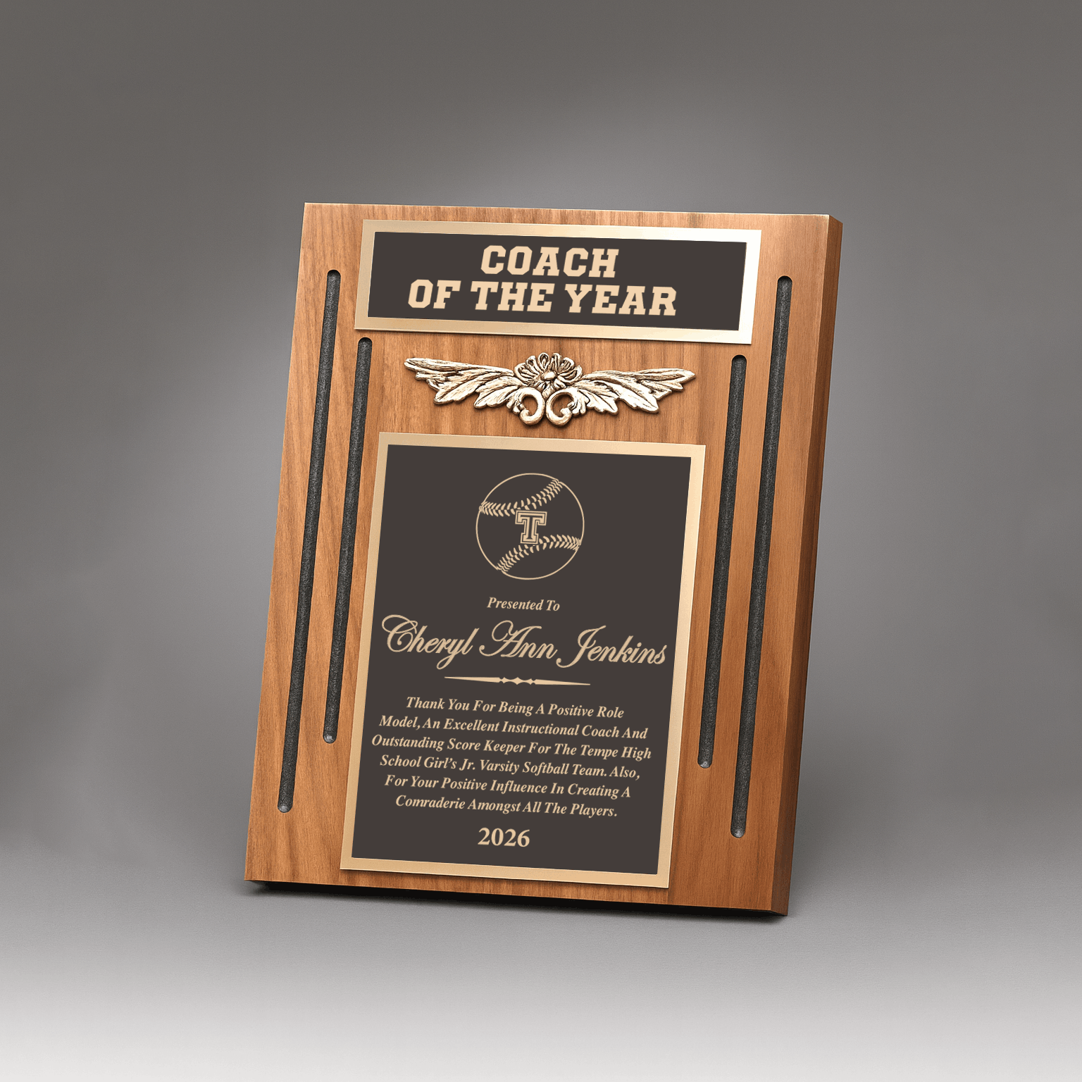 Standing in a bold posture with its clean-edged cut and salient architecture, the Crest Accent Plaque w/ Border Plate by Lane Award features a dual-plate design, united by an intricate, brass ornamentation. Decorated with geometrically congruent laser accents, this marvelous creation is available in three sizes, and comes complete with your choice of overlay and underlay colors in beautiful gloss and brushed finishes.