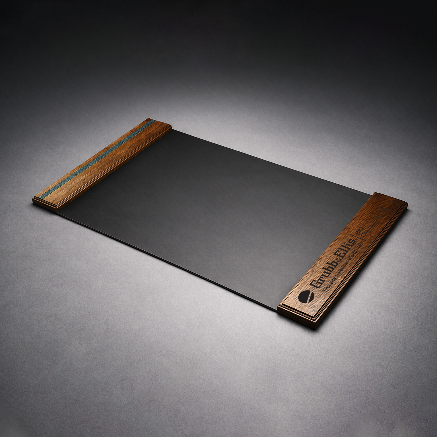 Preserve the look and value of your precious surfaces with the intelligently designed Desk Pad Holder w/ Sherwood Green Avonite® by Lane Award. Brilliantly crafted to protect your desktop from unsightly scratches and script impressions, our multi-use desk pad holder creates a sophisticated safeguard for even the most active workstations. This luxuriously svelte Desk Pad Holder by Lane Award is decorated with a brilliant band of green Avonite®, for a boldly unique and distinguished finish. A true token of benefit and beauty, the Desk Pad Holder w/ Sherwood Green Avonite® by Lane Award is the perfect, practical accessory for any workspace.