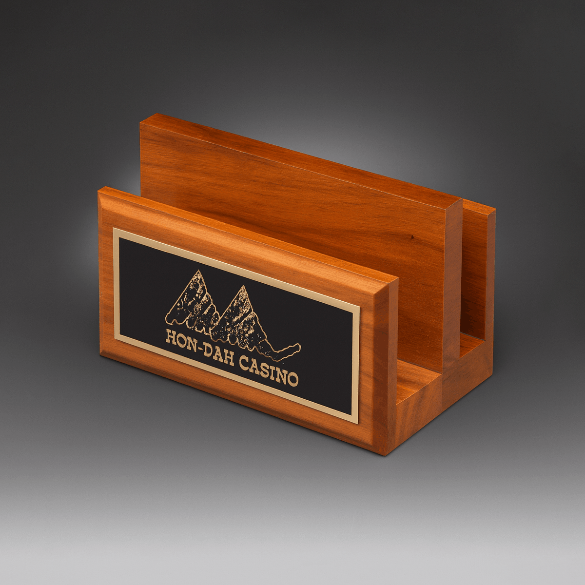 With dual compartments separated by a tall center divider, the Double Letter Holder by Lane Award is an essential commodity for maintaining a well-organized, professional workspace. With a lean yet spacious design, the Double Letter Holder by Lane Award is crafted in rich, solid, genuine walnut, decorated with a personalization plate available in a variety of overlay colors (black brass, brushed blue, brushed copper, brushed gold, brushed red, brushed silver, gloss black, or gloss brown). The Double Letter Holder by Lane Award is the perfect desktop organizer for executive level excellence.