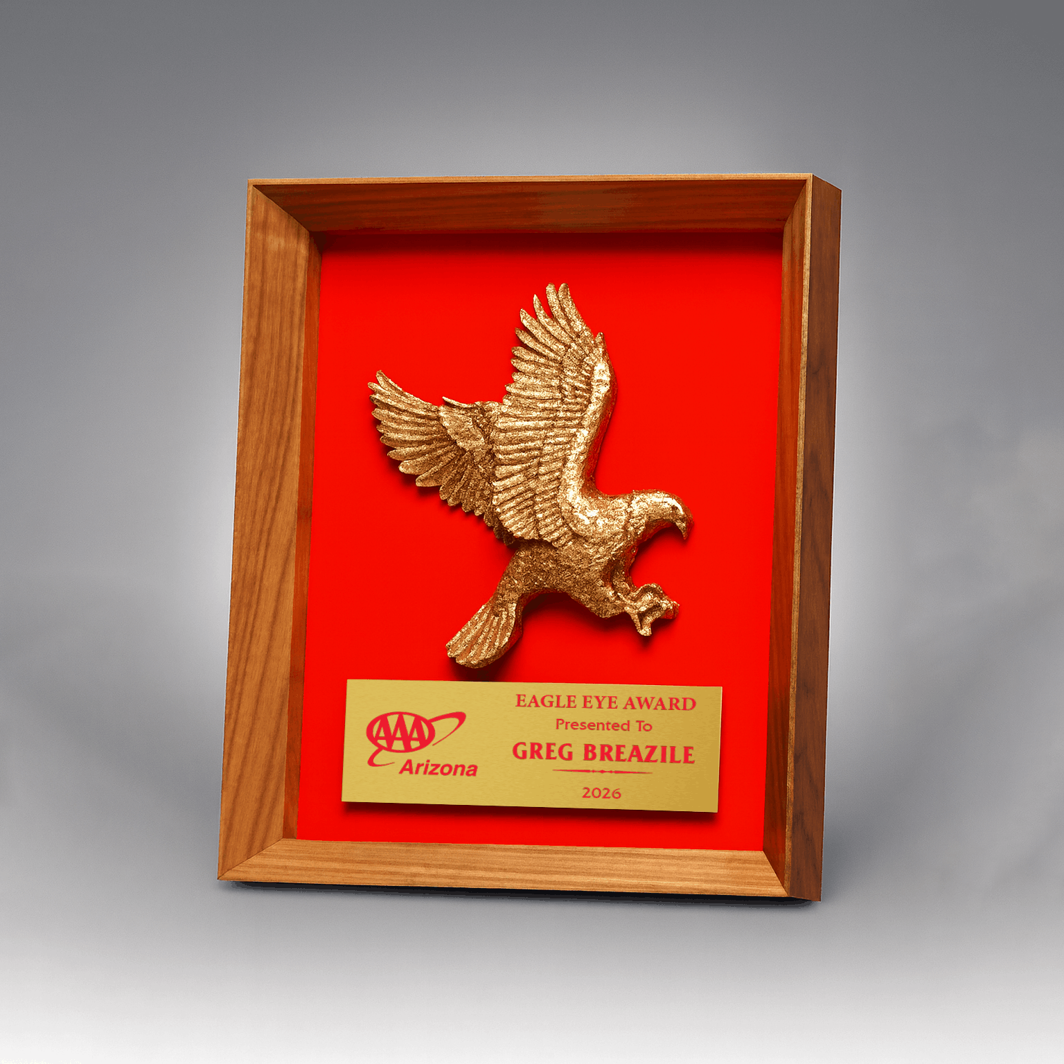 A sensationally unique work of art, the Eagle Inside Bevel Plaque by Lane Award features a gorgeous wooden border encasing a beautifully polished eagle (in your choice of copper, gold or silver) posed in flight above a prominently featured personalization plate, available in a wide variety of colors. The beautifully posh felt backdrop, featured here in a vivid red, is also available in black, royal blue, green, and burgundy, for a look that truly complements any personal style and surrounding décor.
