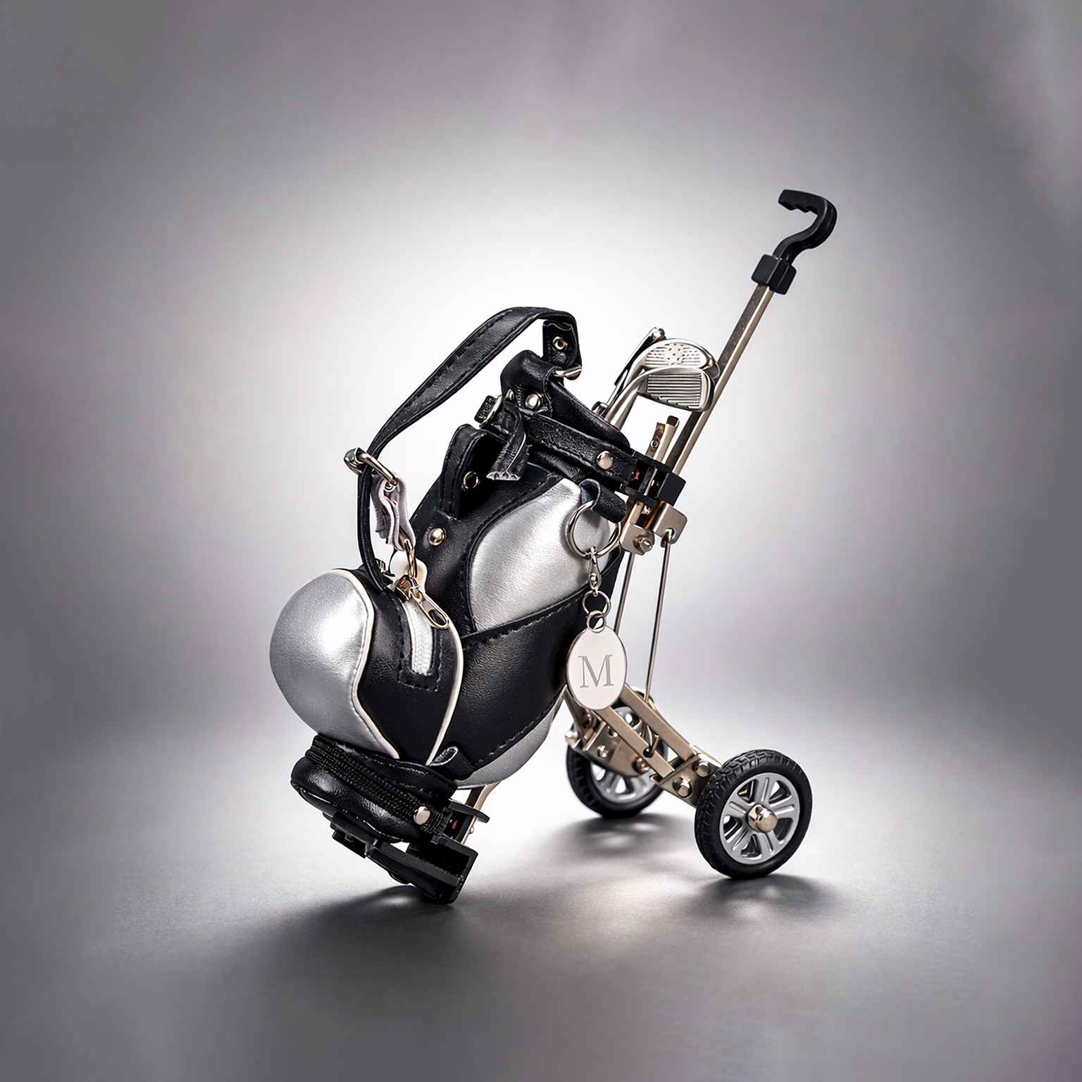 The perfect gift for the dedicated golfer. Our three piece golf club pen set with golf bag and cart will make any golfer happy. Remove the grips on the club handles to reveal the hidden pens. Three different club choices – the 6″ L driver has red ink, the 5.75″ L putter has blue ink and the 5.75″ L wedge has black ink. The black and silver golf bag on cart makes the perfect pen or pencil cup for your desk. The golf bag has two small zippered storage areas, as well as working rubber wheels and moveable golf cart handle. A clip on .625″ x .875″ engraving tag is also included. Non-tarnish brushed silver finish. Gift Boxed.