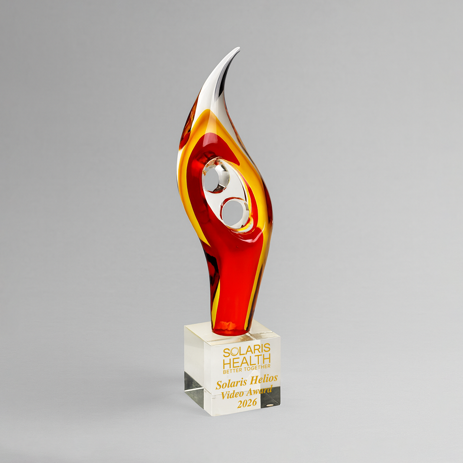 A striking purl of vivid scarlet and warm amber glass rests at the heart of the breathtaking Helios Award. Rising to a dramatic 14.5 inches in height, this hand-blown sculpted glass award rests gracefully upon a cubic, crystalline base, for an unforgettable expression of superlative success.