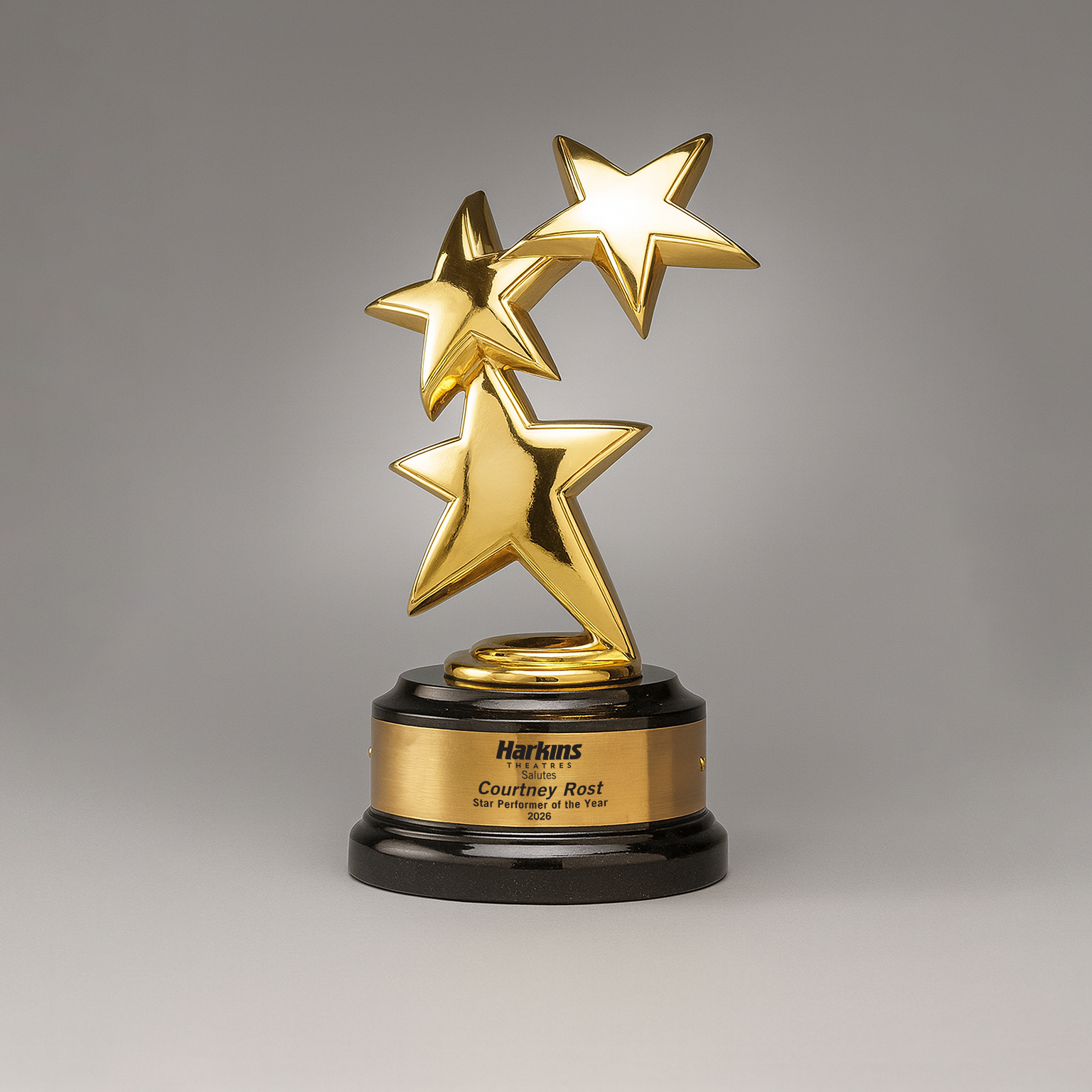 With its three-tiered shooting star arrangement, the Multiple Star Award with Marble Base by Lane Award is a wondrous product of perfection. This remarkable award rises an incredible 11” in height from a beautiful, black marble base elegantly cinched with a gleaming, golden personalization plate. Bursting with a luminous triad of stellar distinction, the Multiple Star Award with Marble Base is a true symbol of superlative greatness, and the perfect selection for showcasing your all-star’s outstanding achievements.