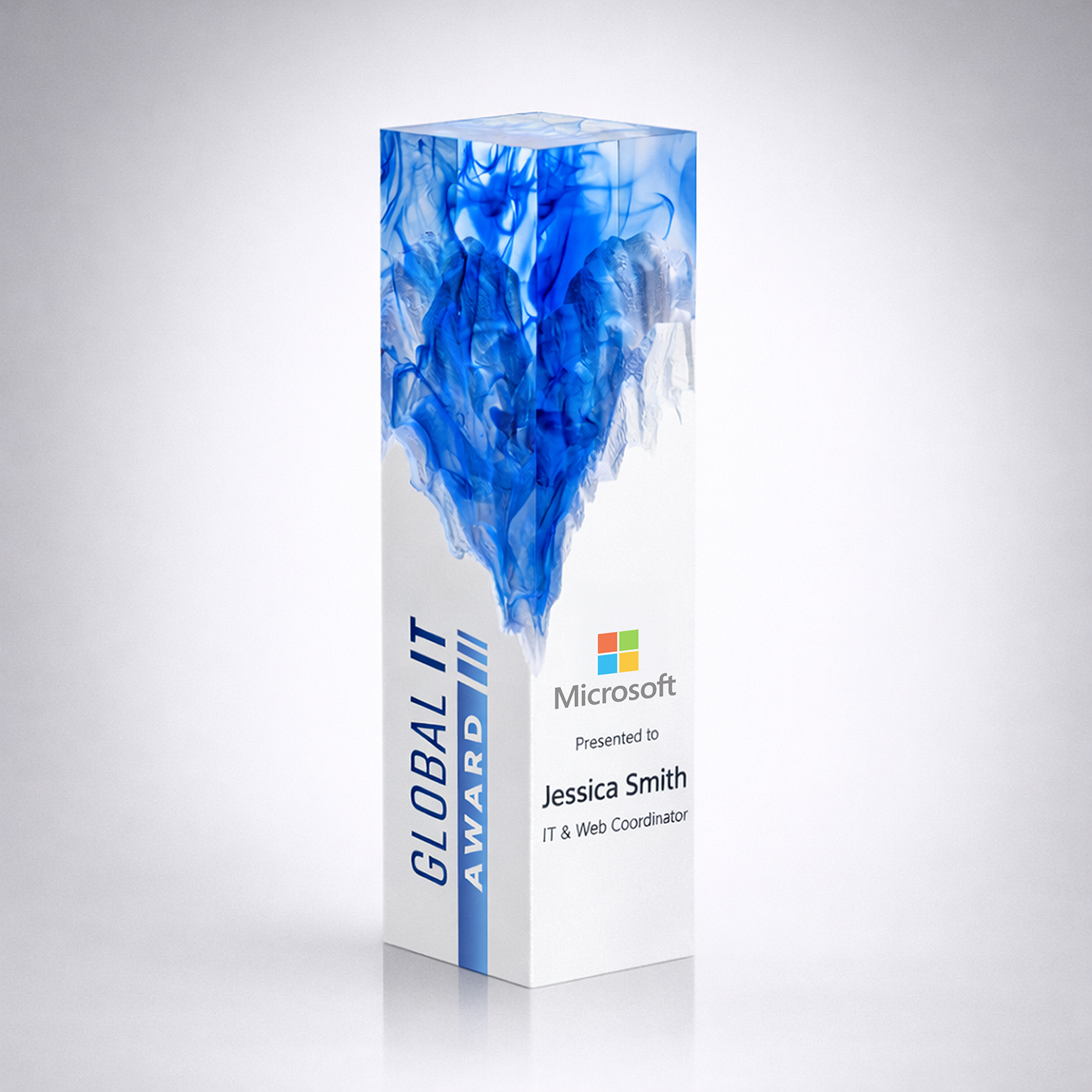 The Olympus Award is a showstopping tribute to the incredible heights of standout innovation and achievement. Set in a striking white Polystone base, this beautiful award captures the unbridled beauty of nature, elegantly encased in a sleek tower design. Its luminous acrylic ceiling is infused with vibrant billows of radiant color in your choice of blue, green, orange, or red, swirling upward into a mesmerizing ethereal bloom.