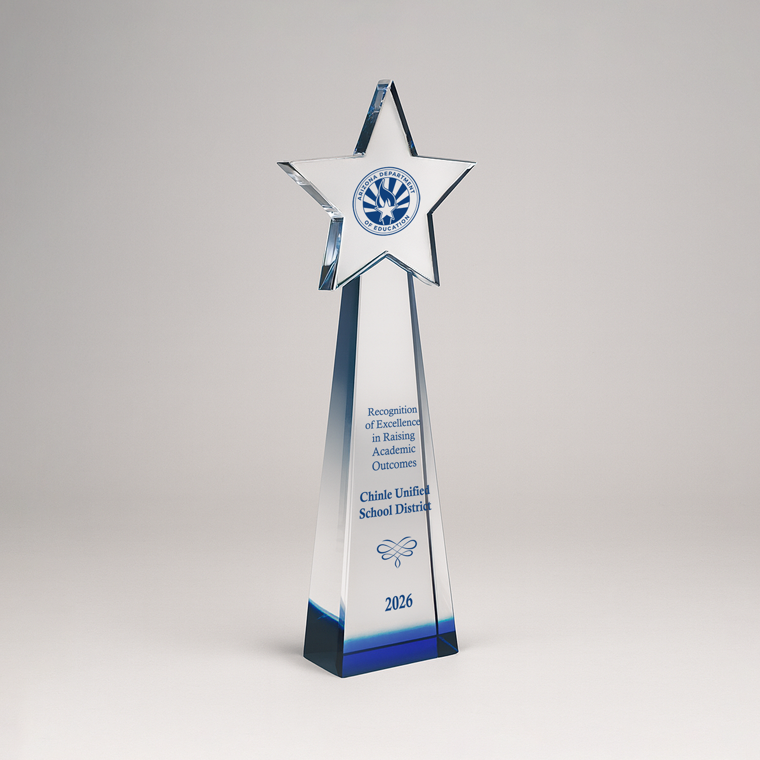 With immaculate detailed fine lines and beveled edges, this is a great award for any occasion. This award offers great etch area on both star and base. The award has a blue crystal inlay that refracts blue colored hues through out the award.