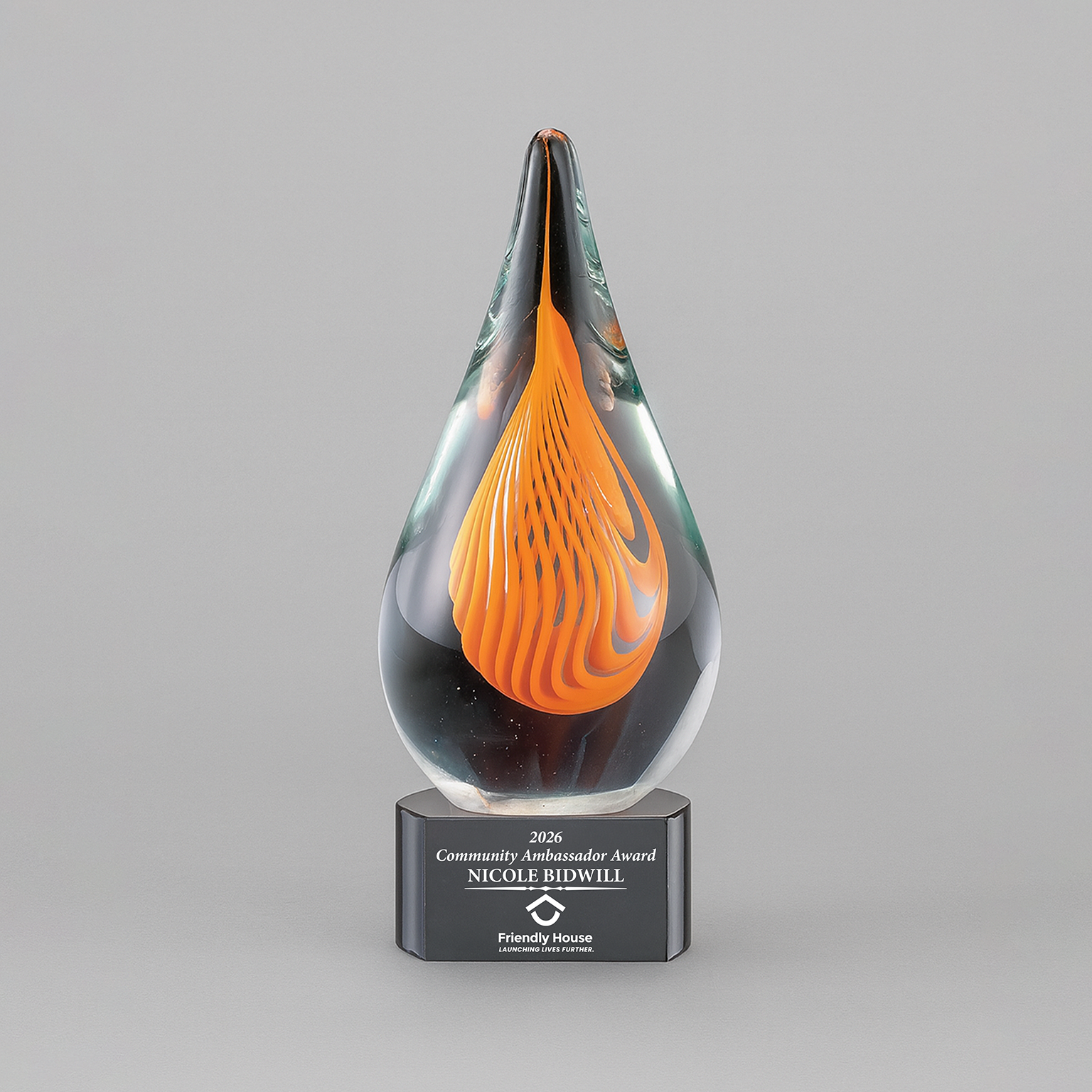 A vibrant burst of bliss and vitality, the Papayan Raindrop Award is an exotic expression of tenacity and vigor. With its delightful, tropic core set prominently at the center of a crystal-clear, glass droplet, this exhilarative hand-blown gem is sure to make an everlasting impression.