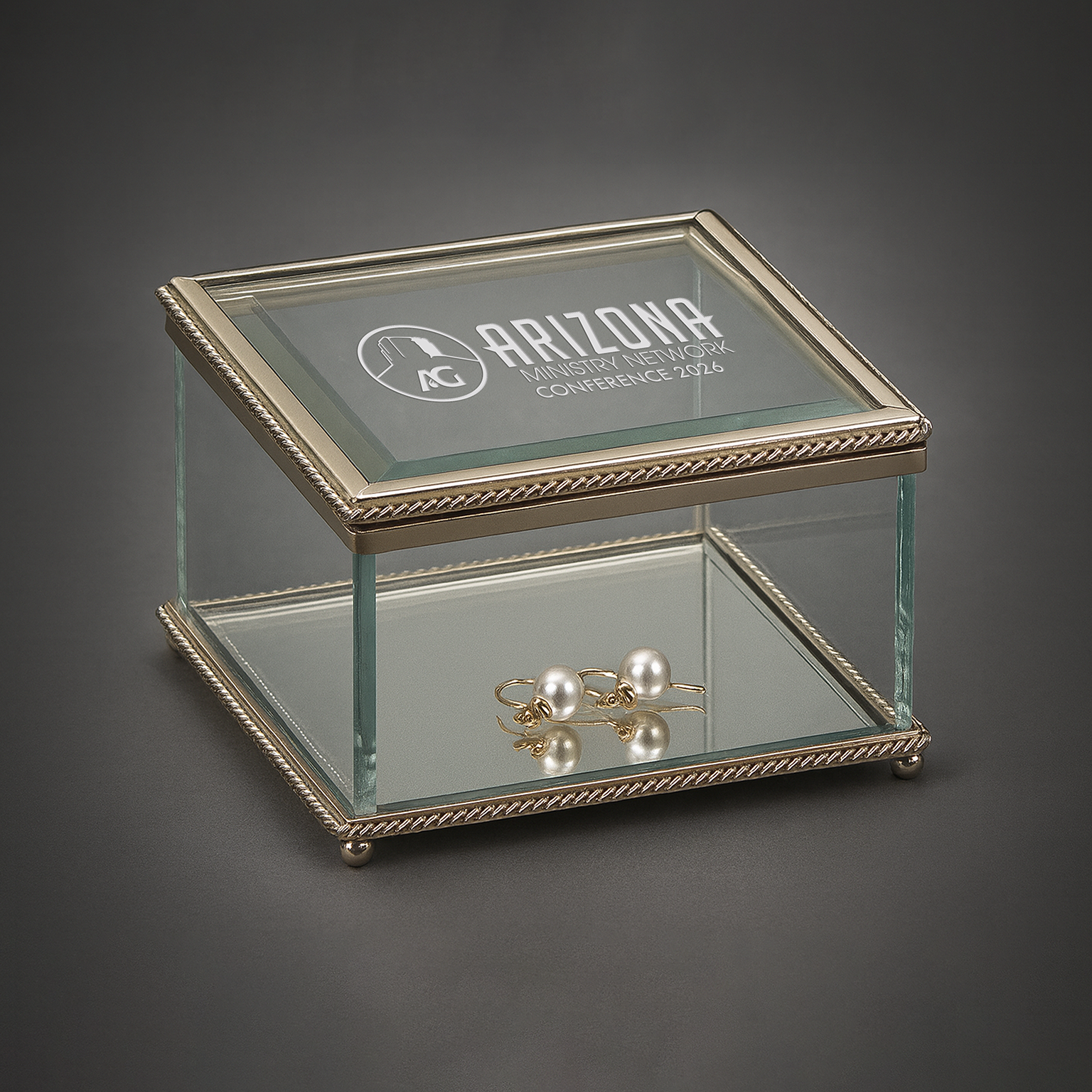 This beautiful 3.75″ x 3.75″ x 2.50″ H square box is glass and has a hinged cover. The top and bottom edges are trimmed with a non tarnish braided border. The inside bottom is a mirror and the bottom of the box has four ball feet. Packed in a plain white box.