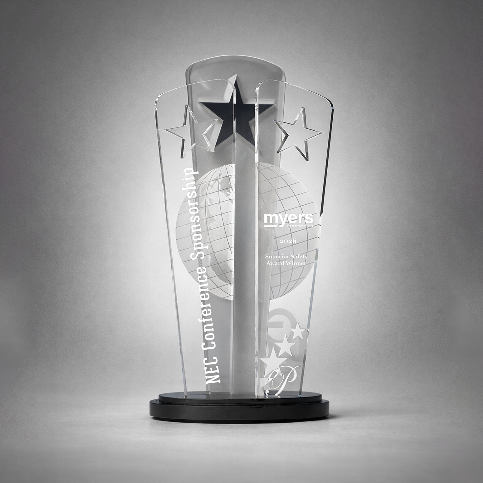 This intriguing display of edgy originality triumphantly towers 13″ above its chic, rounded base. The star-studded planks spanning the frontline of the Triolight Acrylic Award’s tri-sectional body are the perfect preamble to the high-rising attraction of artistic brilliance sitting at the center of the award’s one-of-a-kind design. The three dimensions of the Triolight Acrylic Award fan outward in a harmonious arrangement, each dimpled with a broad star cut-out for a uniquely uniformed finish. For your next award ceremony, leave your crowd astonished with the creative captivation of the Triolight Acrylic Award.
