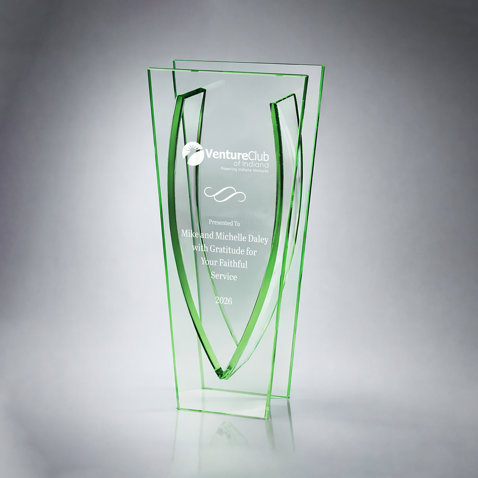 This unique V-shaped jade glass vase doubles as a practical gift and as an award to showcase your accomplishments. A large engraving area allows enough room for that perfect message. Includes gift box.